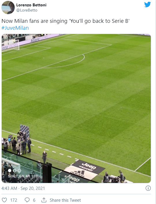 来源:24直播网09-20 11:3124直播网9月20日讯 据FootballItalia记者洛伦佐-贝托尼报道,在尤文vs米兰的比赛后,米兰球迷唱歌嘲讽对手,称尤文就要降级了。