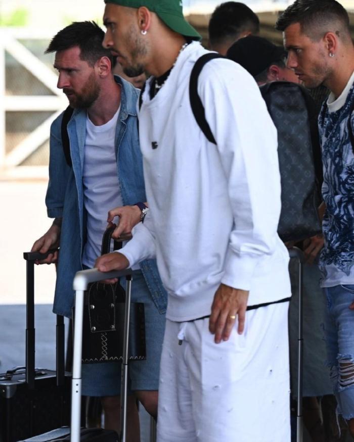 由于北京正值6月盛夏,天气十分炎热。梅西与几位阿根廷国家队队友衣着也十分清爽随性。梅西穿着宽松的蓝色衬衫,白色T恤内衬,牛仔中裤,背着小背包。