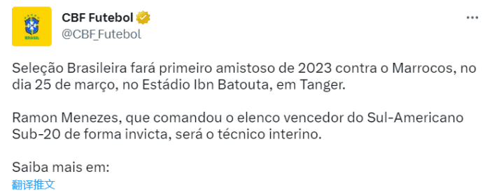 巴西足协表示,巴西队将在3月25日与摩洛哥队进行2023年的第一场友谊赛,带领球队以不败战绩夺得U20南美锦标赛冠军的拉蒙-梅内塞斯将担任球队的临时主帅。