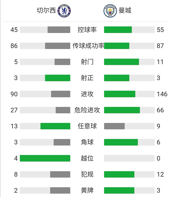 第55分钟,切尔西取得领先,芒特直塞身后,维尔纳横传门前,齐耶赫包抄破门,切尔西1-0领先曼城。